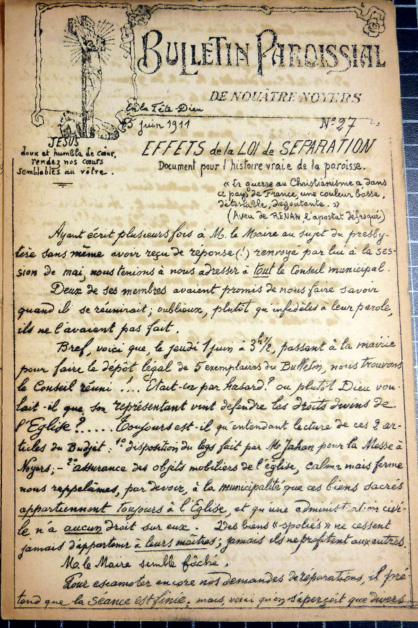 Il est vrai que la loi de séparation de l’église et de l’état ne datait que du 9 décembre 1905, et les querelles n’étaient pas éteintes.