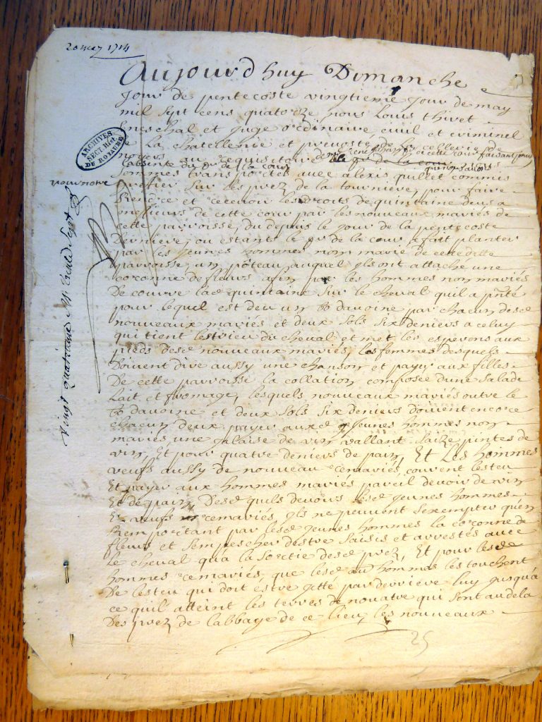 Les femmes des mariés ou remariés devaient dire une chanson sur le pré et payer aux filles de la paroisse une collation composée d’une salade, de lait et de fromage. Certaines années elles devaient faire une révérence et saluer d’un baiser les Seigneurs où les officiers qui les représentaient