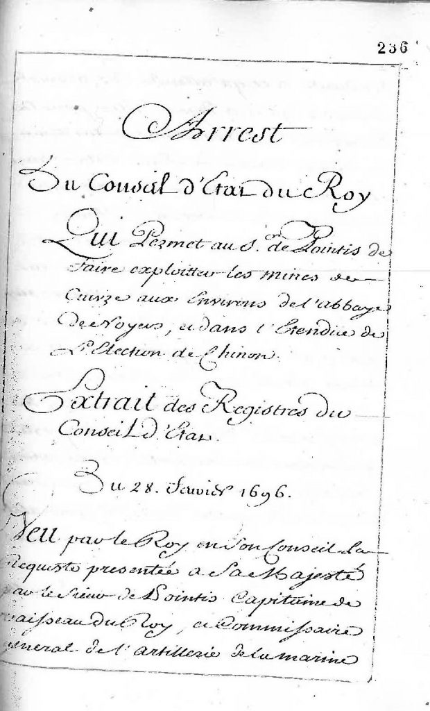 Pour remercier de ses services ce grand marin le roi Louis XIV donna, par un arrêt du Conseil d’État du 28 février 1696 l’autorisation d’exploiter à son profit moyennant diverses formalités. L’arrêt indique que « Le sieur Miromesnil, conseiller du Roi et ses conseils, maître des requêtes ordinaire de son hôtel, commissaire départi pour l’exécution des ordres de sa majesté dans la généralité de Tours, précisant qu’en creusant cette mine plus avant on en peut espérer un avantage considérable ».